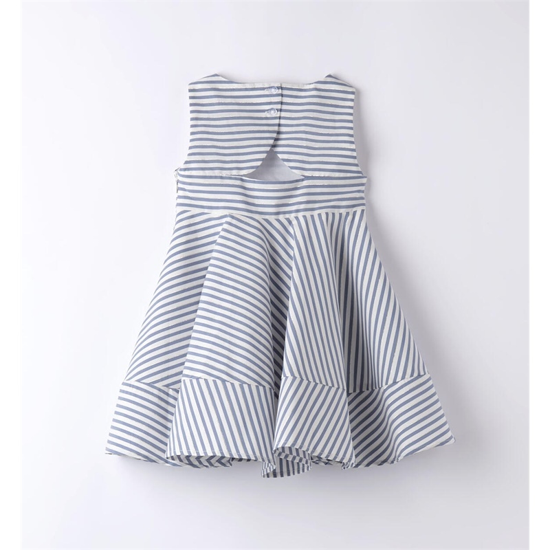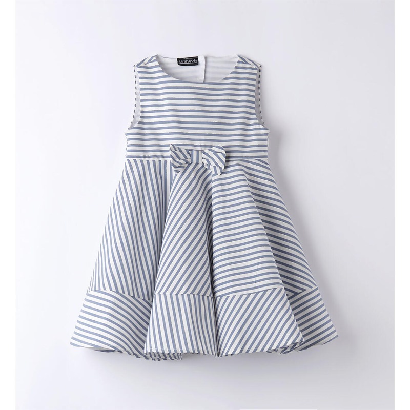 Abito Sarabanda per bambina smanicato in popeline stretch di cotone con trama a righe, dai dettagli lurex. Applicazione fiocco sul punto vita e lunghezza al ginocchio. Apertura dietro con zip invisibile e fodera in cotone.