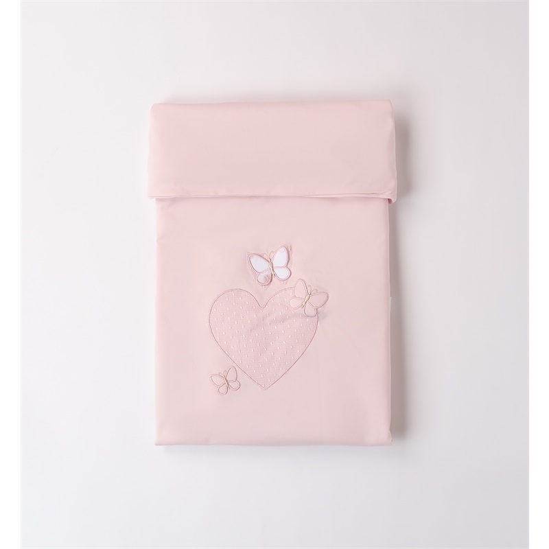 Copertina per neonata Minibanda in jersey stretch di cotone, con imbottitura in ovatta. Il modello presenta fantasia tinta unita con farfalle in applicazione.