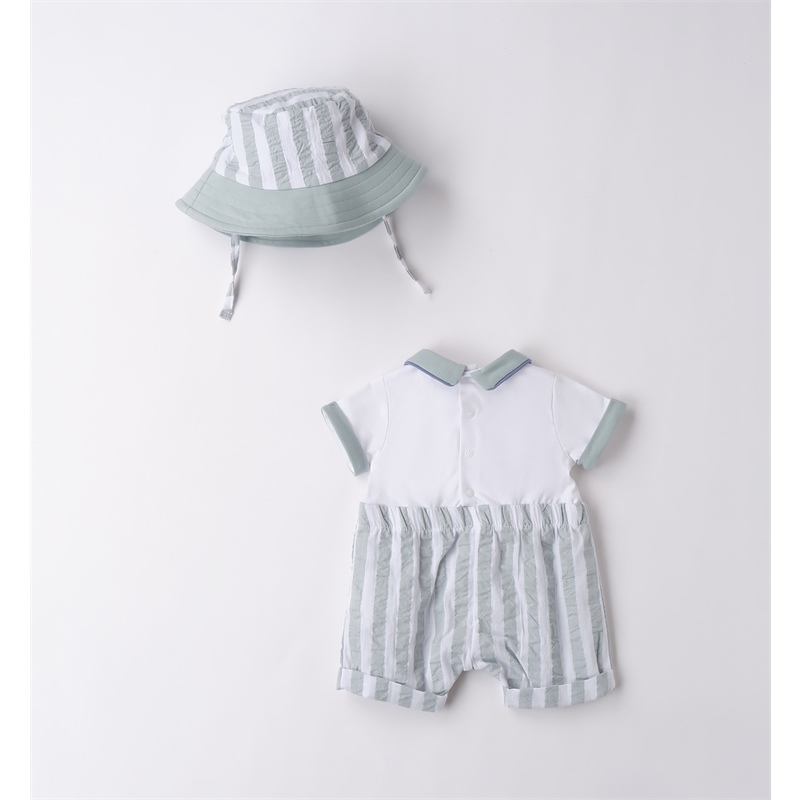 Pagliaccetto per neonato Minibanda realizzato in 100% cotone. Il modello presenta apertura sul retro e nel sottogamba con bottoni a pressione per agevolare il cambio e la vestizione. Fantasia a righe. Il pagliaccetto รจ venduto con cappellino a righe in abbinamento.