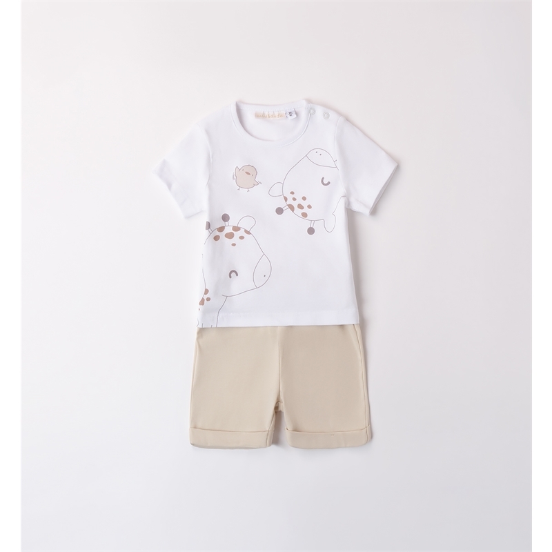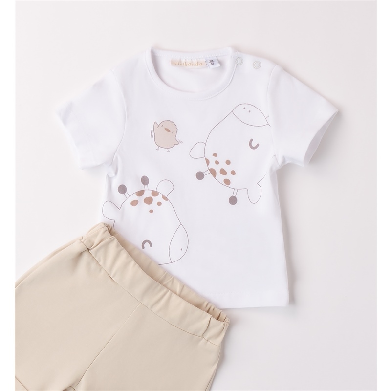 Completo bimbi due pezzi Minibanda realizzato in jersey stretch di cotone. La T-Shirt presenta apertura sulla spalla con bottoni a pressione per agevolare il cambio e la vestizione, fantasia tinta unita, tema giraffe. I pantaloni hanno vita elasticizzata, fantasia tinta unita e risvoltini sul fondo.