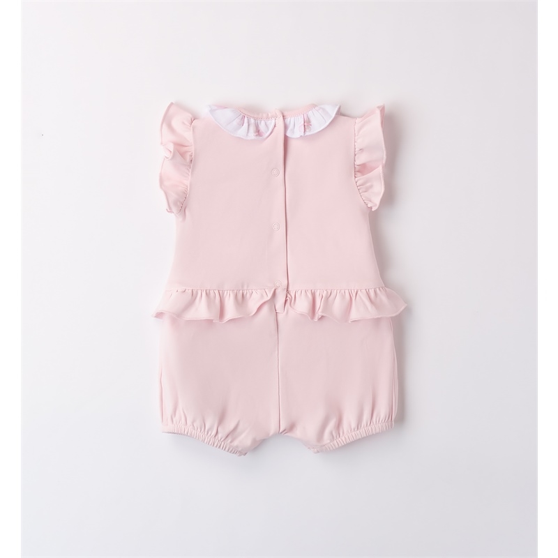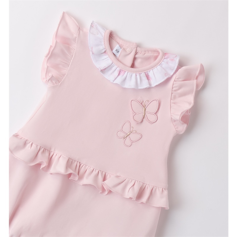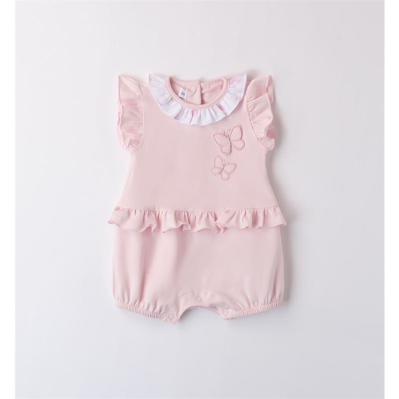 Pagliaccetto per neonata Minibanda realizzato in jersey stretch di cotone. Il modello presenta apertura sul retro e nel sottogamba con bottoni per agevolare il cambio e la vestizione. Il pagliaccetto รจ in fantasia tinta unita con farfalle in applicazione.