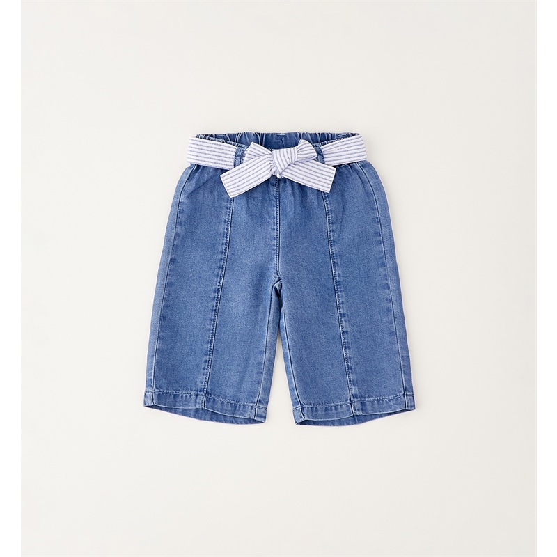 Pantalone denim largo con cintura in vita, motivo a righe con fiocco centrale.